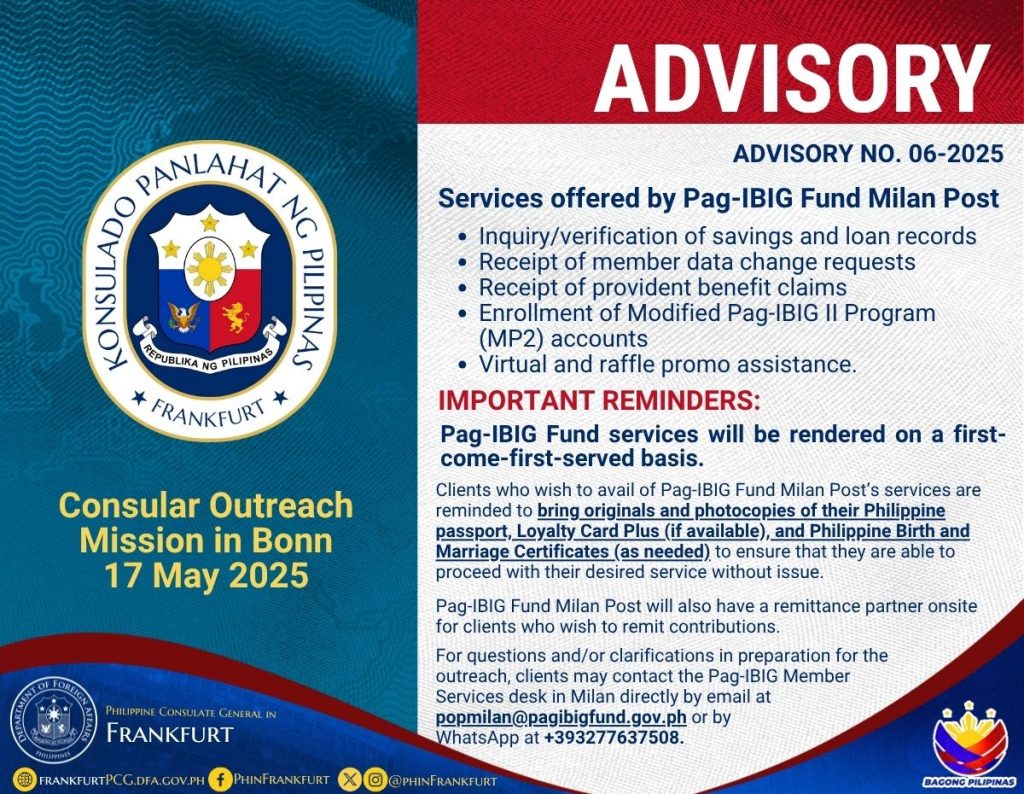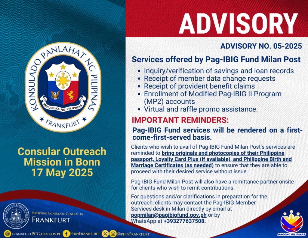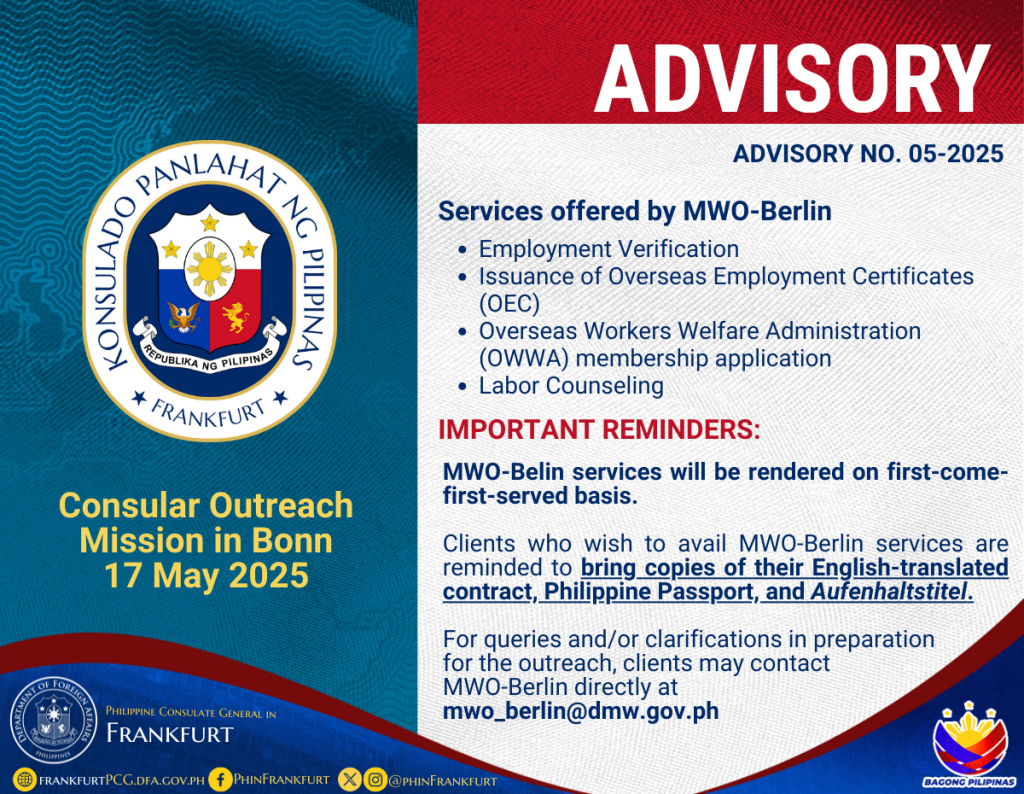 Advisory No. 06-2025: Consular Outreach Mission in Bonn on 17 May 2025